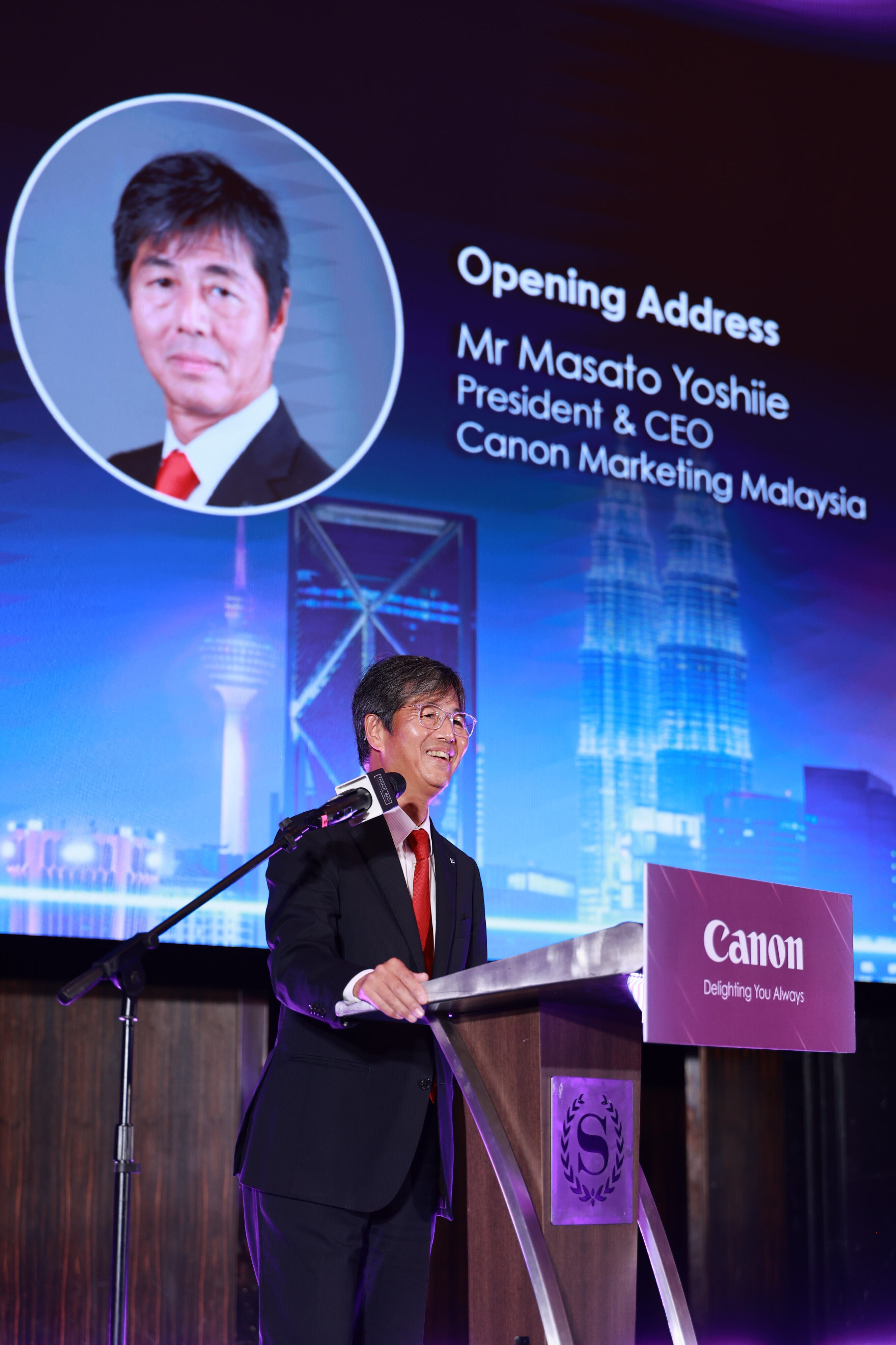 Masato Yoshiie, President & CEO of Canon Marketing Malaysia, welcomes guests to Canon’s “Think Big” event at Sheraton Petaling Jaya, setting the stage for an inspiring showcase of innovation and business transformation.