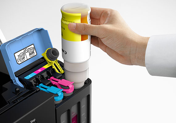 Ink bottles are truly spill-resistant, with a unique tip-and-receptacle design. Ink filling stops automatically when the air hatch of the tank touches the fluid level.