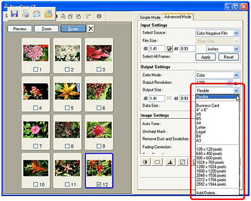 You must select the Output Size for each individual frame that you are scanning by clicking it to display the blue selection frame and then selecting the Output Size.