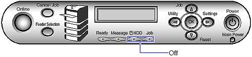 - When you are using a hard disk, make sure that the HDD indicator is not on. If you turn the printer OFF while the HDD indicator is on (while data is being read from the hard disk or being written to the hard disk), the hard disk may be damaged and disabled.