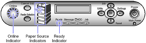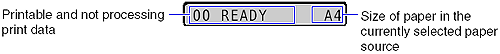 If no abnormality is found during the self-diagnostic test, the Online indicator, Ready indicator and Paper Source indicator for the currently selected paper source come on, <00 READY> appears in the display, and the printer is ready to print.