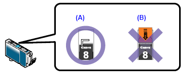 Make sure all of the orange tape is peeled off the ink tank and the air hole is exposed, as illustrated in (A). If any orange parts are left as in (B), remove all of the orange parts.