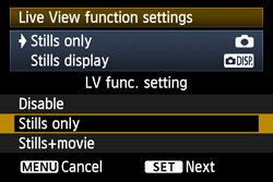 7. The [Live View function settings] window appears, so set the [LV func. setting] type. Turn the <Quick Control Dial> to select [Stills only], and then press the <SET> button.