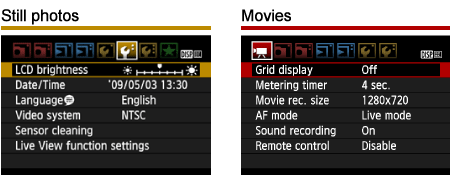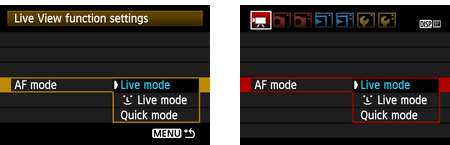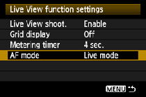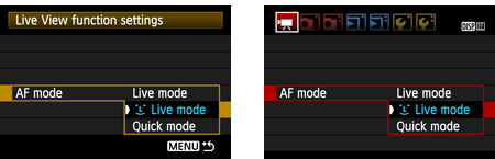 - To shoot still photos, select [Live View function settings], and then press the <SET> button. After that, select [AF mode], and then press the <SET> button.