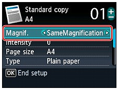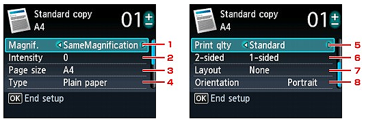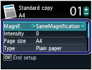 - Depending on the copy menu, some setting items cannot be selected. This section describes the setting items in Standard copy.