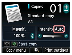 Specify the intensity. When Auto is selected, the intensity is adjusted automatically according to the originals loaded on the Platen Glass. Auto is displayed on the slide bar for the intensity on the Copy standby screen.