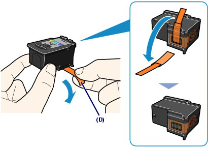 (1) Take a new FINE Cartridge out of its package and remove the orange protective tape (D) gently.
