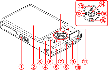 ![]() | Zoom lever Shooting: (telephoto) / (wide angle)Playback: (magnify) / (index) | ![]() | Flash |