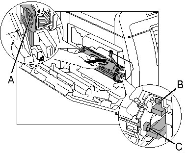 The left edge (A) and the right side protrusions (B, C) of the toner cartridge should be aligned with the guides inside the machine.