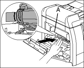 2. Grasp the blue plastic pull tab (A) on the toner cartridge.