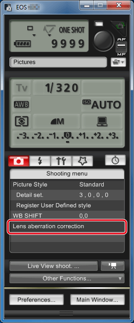 Using the supplied EOS Utility software, you can register lens peripheral illumination correction data in the camera or delete registered data from the camera.