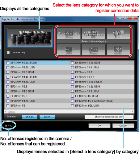 For more information on the lenses that can be registered, please refer to the list of lenses compatible with the Lens Aberration Correction feature of Digital Photo Professional in the links below.