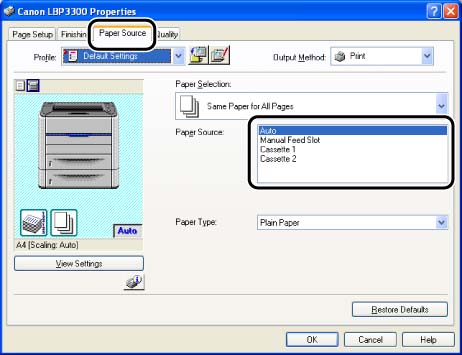 4. Display the [Paper Source] sheet, then select [Paper Source].