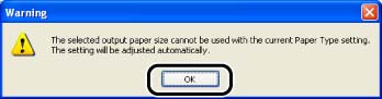 a. If you set [Page Size] to [Index Card], [Envelope DL], [Envelope COM10], [Envelope C5], or [Envelope Monarch], the following message appears, and [Paper Type] is automatically specified.