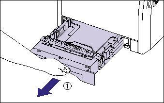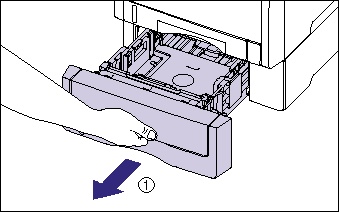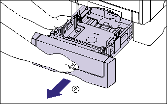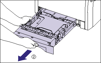 While holding the paper cassette with both hands, remove it from the paper feeder as shown in the figure (2) .