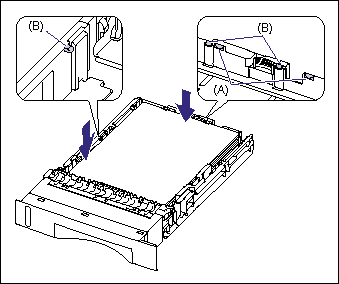 4. Hold down the paper as shown in the figure, make sure that the paper stack does not exceed the load limit marks (A), and then set it under the hooks (B) on the paper guides.