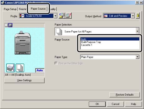 | [Paper Source] | [Auto] [Multi-Purpose Tray] [Cassette 1] | Specifies which paper source or paper type is used for printing each page. The pages for which you can select the paper source or paper type depend on the setting selected for Paper Selection. |