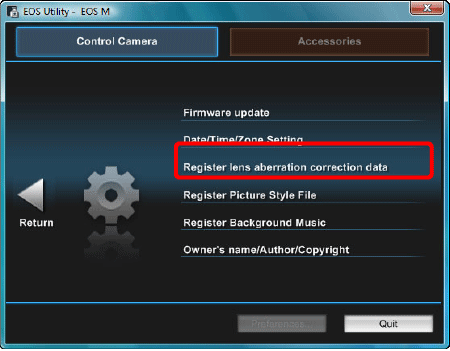 Using the supplied EOS Utility software, you can register lens peripheral illumination correction data in the camera or delete registered data from the camera.