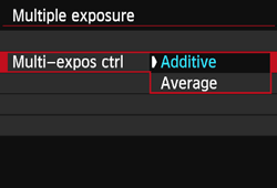 - If you perform Live View shooting while [Additive] is set, the Live View function will stop automatically when the multiple-exposure shooting ends.