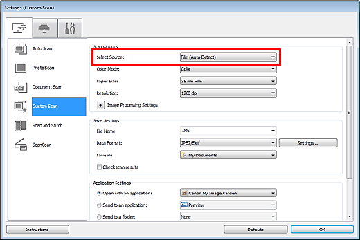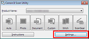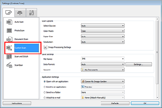 - Scanned images are saved in the folder set for Save in in the Settings (Custom Scan) dialog box displayed by clicking Settings.... In the Settings (Custom Scan) dialog box, you can also make advanced scan settings.