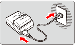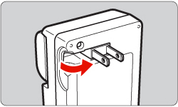 As shown by the arrow, flip out the battery charger's prongs and insert the prongs into a power outlet.