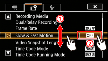 - During slow & fast motion recording mode, the running mode of the time code is set to [Rec Run] or [Regen.] and the time code will advance by the number of frames recorded. If you activate slow & fast motion recording mode while the running mode is set to [Free Run], the running mode will automatically change to [Rec Run]. When you end slow & fast motion recording mode, the running mode will return to its previous setting.