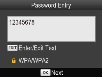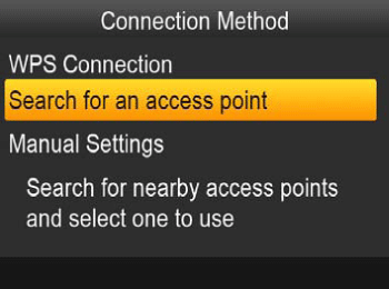 > button and select [Manual Settings] in step 6 to specify the access point manually. Follow on-screen instructions and enter the SSID, security settings, and the password. - If WEP security is used and you enter the wrong password in step 8, when you press the <OK> button and then press the <OK> button again after the message, you will go to step 9, but printing is not possible. Check the access point password and try to connect again, starting at step 3.
