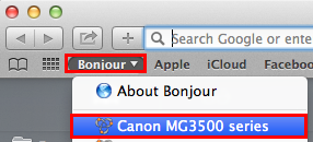 (6) In the Favorites bar, click [ Bonjour ], and select [ Canon MG3500 series ] from the menu.