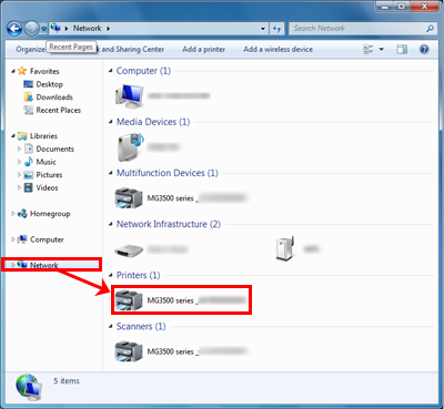 (4) In the window, click [ Network ]. The MG3500 series icon (MG3500 series_xxxx) is displayed.
