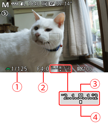 • An exposure level mark based on your specified value is shown on the exposure level indicator for comparison to the standard exposure level.