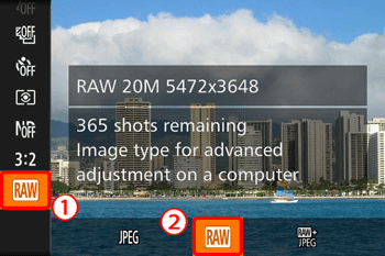 [RAW+JPEG]![]() | Records two images, both a RAW image and a JPEG image, for each shot. The JPEG image can be viewed on a computer or printed without using the software. |