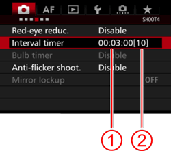 - If a picture is taken or an image is being processed as the next interval timer shooting, that interval timer shooting will be canceled. This will make the number of interval timer images captured lower than the set number of shots.