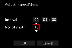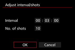 | No. of shots | Settable from [01] to [99]. If you set [00], the camera will keep shooting until you stop the interval timer. |