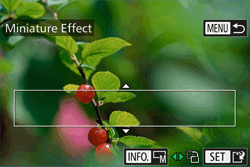 Miniature Effect [ ] | Creates the effect of a miniature model, by blurring image areas above and below your selected area. You can also make movies that look like scenes in miniature models by choosing the playback speed before the movie is recorded. People and objects in the scene will move quickly during playback. Note that sound is not recorded. |