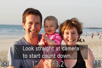 The camera will shoot about two seconds after detecting that the face of another person (such as the photographer) has entered the shooting area. This is useful when including yourself in group photos or similar shots.