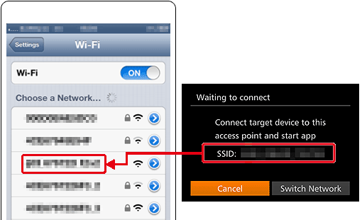 A-4. Choose the SSID (network name) displayed on the camera’s screen from the list of access points displayed on the smartphone.