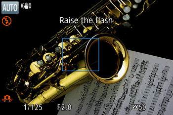 When shooting in [AUTO] mode or [Hybrid Auto] mode in low-light conditions, [Raise the flash] may be displayed on the camera’s screen. In this case, please move the <