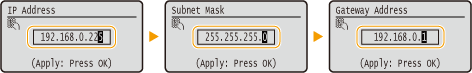 <Gateway Address>. - Enter each setting using the numeric keys, and press