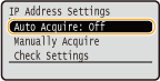 Select to configure the IP address settings by manually entering an IP address. In order to select this option, <Auto Acquire> must be set to <Off>.