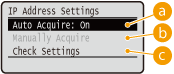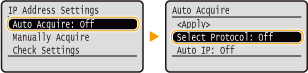 Select to automatically assign an IP address via DHCP protocol. When <Auto Acquire: On> is displayed, automatic addressing is enabled.