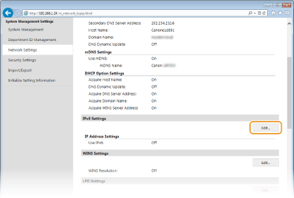 The IPv6 addresses of the machine can be configured via the Remote UI. Before setting IPv6 addresses, check the IPv4 address settings. You need to set the correct IPv4 settings to use IPv6 addresses. The machine can use up to nine of the following IPv6 addresses: