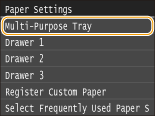 - If you always load the same paper in the multi-purpose tray, you can skip the paper setting operations by registering the paper size and type as the default setting. When the default setting is registered, however, the screen shown above is not displayed. To display the screen, select <Paper Settings>