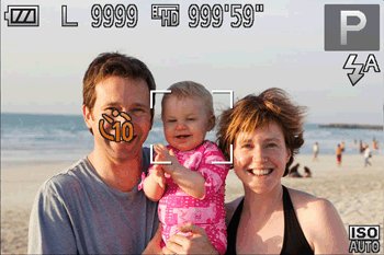 The camera will shoot about two seconds after detecting that the face of another person (such as the photographer) has entered the shooting area. This is useful when including yourself in group photos or similar shots.