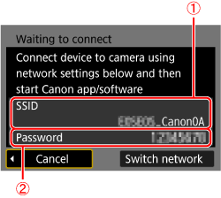 • Check the SSID (network name) ( ) and password ( ) displayed on the camera’s LCD monitor.