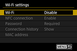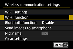 Press the <MENU> button to display the confirmation dialog. Select [OK], then press < > to terminate the Wi-Fi connection.
