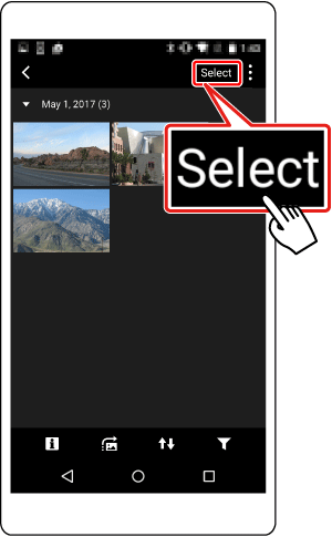 When a list of images in the camera appears on the smartphone, tap [Select] on the upper right of screen.