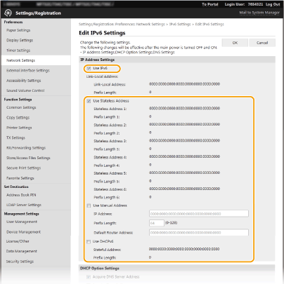 Connecting the machine to a network requires a unique network IP address. Two versions of IP addresses are available: IPv4 and IPv6. Configure these settings depending on the network environment. To use IPv6 addresses, you need to properly configure the IPv4 address settings.