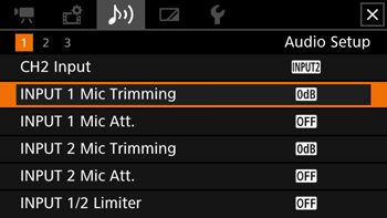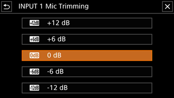 Audio Setup] > [INPUT 1 Mic Trimming] or [INPUT 2 Mic Trimming].
