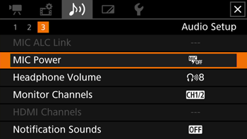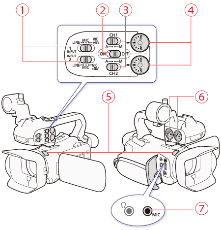: MIC terminalWhich audio inputs are recorded to which audio channels is determined by a combination of menu settings, whether the handle unit is attached, and other audio-related controls on the camcorder. The following table gives an overview of the possible combinations.